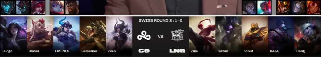 Suite à un mouvement de Zven à 4 minutes, Scout est forcé à flash out : LNG jouent calmement dans les premières minutes puisqu’ils scalent avec Tristana, Azir et Jax. Le premier dragon océan récupéré par l’équipe asiatique donne beaucoup d’espace à Zika sur sa lane alors qu’il la domine d’ores et déjà. Cependant, le premier herald est bien récupéré par les nord-américains à 9 minutes. GALA push bot et prend 2 plaques, et, pendant ce temps, Scout trouve une élimination sur Emenes, grâce à une bonne partition impériale suivie par un kick flash de Tarzan. C9 est devant contre toute attente, mais LNG reste lucide et leur laisse le Nashor pour s’emparer du troisième dragon : C9 joue son buff, push mid, mais l’accélération des asiatiques est monstrueuse. Kick de Lee Sin sur 3 personnes, triple stun de Jax, one shot de Renekton par Scout et la partie est à nouveau entre les mains de la composition chinoise. Jax met trop de pression en side, C9 tente donc leur va-tout sur GALA dans la river top. Celui-ci temporise trop longtemps, on s’empalle sur les LNG qui échangent leur ADC contre un ace avant de récupérer le baron Nashor et de finir la partie à 32 minutes.