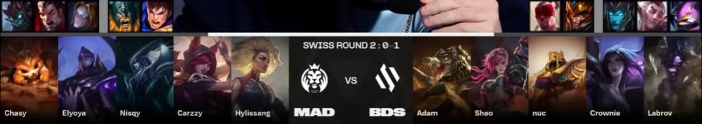 Sheo est mis au fond dès les premières minutes du match puisque Elyoya trouve des invade à répétition. Il poursuit sur sa lancée et tombe sur Vi sur ses corbins : il est accompagné de Rell, et est niveau 6 contre le niveau 4 du jungler adverse. Sheo se fait détruire, mais nuc tient bien en midlane et constitue l’espoir de son équipe. A 13 minutes, Carzzy trouve un solokill sur Crownie tandis que Chasy élimine Adam et prend 3 plaques. Hylissang se perd et donne des ressources au midlaner BDS, mais Elyoya ne s’arrête pas d’aller subtiliser les camps de Sheo : il a 3 niveaux d’avance et semble inarrêtable. Minute 28, le jungler français vole le Nashor sous les yeux des MAD et fait durer un petit peu la partie ; un combat éclate à l’orée du dragon Hextech, mais l’équipe suisse se troue complètement et perd 4 joueurs en plus de l’âme. Seul Crownie est en vie, mais il ne peut rien faire. La partie se finit à 32 minutes, les MAD ont été très convaincants et ont enfin pu jouer leur jeu ! BDS est donc dos au mur, en 0-2 : ils joueront un BO3 éliminatoire le 22 octobre à 9h.