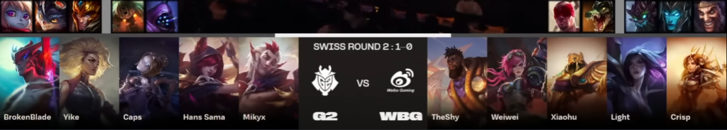 Dans ce 6ème match, G2 affronte le seed 4 chinois WBG et les pronostics sont très partagés : G2 monte en puissance depuis le début de l’année tandis que les asiatiques ont une équipe extrêmement solide. Tous les joueurs ont beaucoup d’expérience, Xiaohu et WeiWei font très peur mais les européens ne sont pas en reste ! Caps a été finaliste des Worlds à deux reprises en 2018 et 2019, Mikyx en 2019, et, mise à part Yike, toute la line-up joue au plus haut niveau depuis quelques années maintenant.