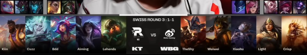 Ce match est très dur à prédire : KT fait une assez bonne année et arrive en tant que seed 1 de Corée, notamment transcendés par des carry ayant les épaules pour porter les parties compliquées. WBG, eux, débarquent à Séoul en tant que seed 4 ! Les deux compositions montrent un très haut niveau mais les calls ne sont pas assez affutés pour mener une partie de A à Z.